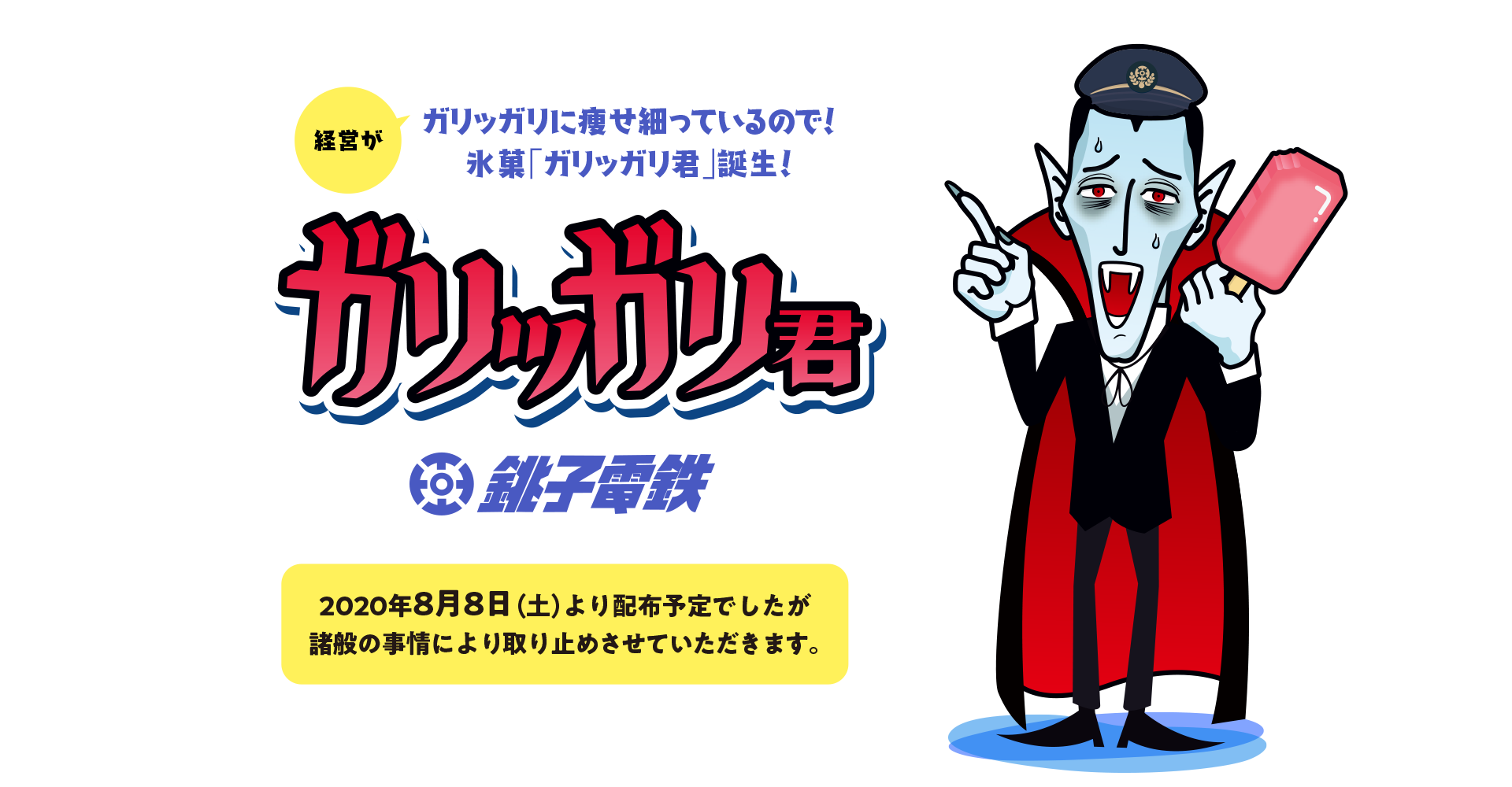 そんな中、ガリッガリ君という名の痩せ細った妖怪が銚子周辺に現れ、弊社売店の冷蔵庫に棲み付いたとの噂を耳にしました。見た目は吸血鬼のようですが、「金欠鬼」という妖怪の一種だそうで、福をもたらす存在でもあると聞き及んでおります。